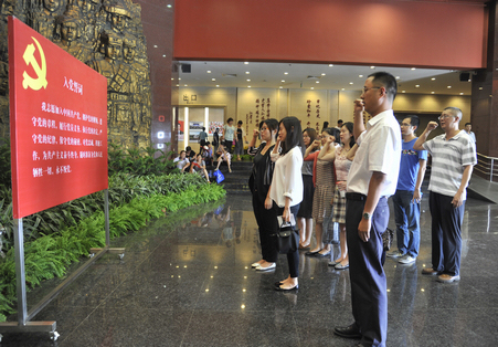 在抗日纪念馆大厅的雕塑前,支部两名新加入党组织的同志面对党旗进行了庄严的宣誓,老党员重温了入党誓词。当铮铮誓言在耳边回响,大家对自己的党员身份都有了沉甸甸的感受——加入党组织,不仅是光荣和进步,更是责任和使命。