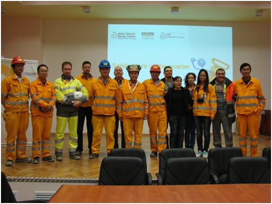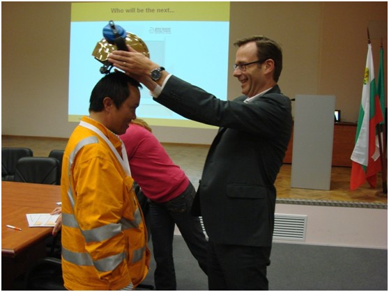 此次为第三季度“安全标兵”表彰。通过前期提名、投票,申博太阳城天津公司保加利亚项目部中国籍员工邓绍波被评选为新线建设“安全标兵”。Devnya Cement总经理Serge Schmidt为邓绍波同志颁发了代表荣誉的胸章和“金帽子”,并对他在新线建设中所表现出的高安全意识及安全行为给予了肯定,授奖时在场人员报以热烈的掌声。